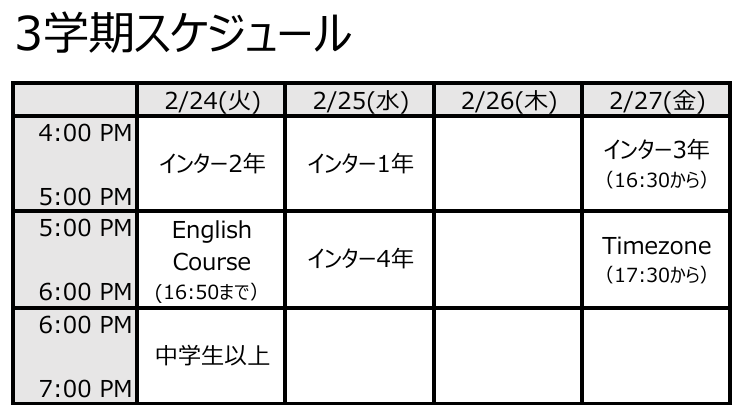 おかえりなさい、みなさん! 冬休みは家族や友だちと楽しい時間を過ごせましたか? 何か楽しいことや面白いことはありましたか? またみなさんに会えるのをとても楽しみにしています。 今年度の残りの期間も、クラスで一緒にがんばりましょう。 これからも友だちと一緒に、学んで、遊んで、楽しい時間を過ごしましょう! 教室で会いましょう!