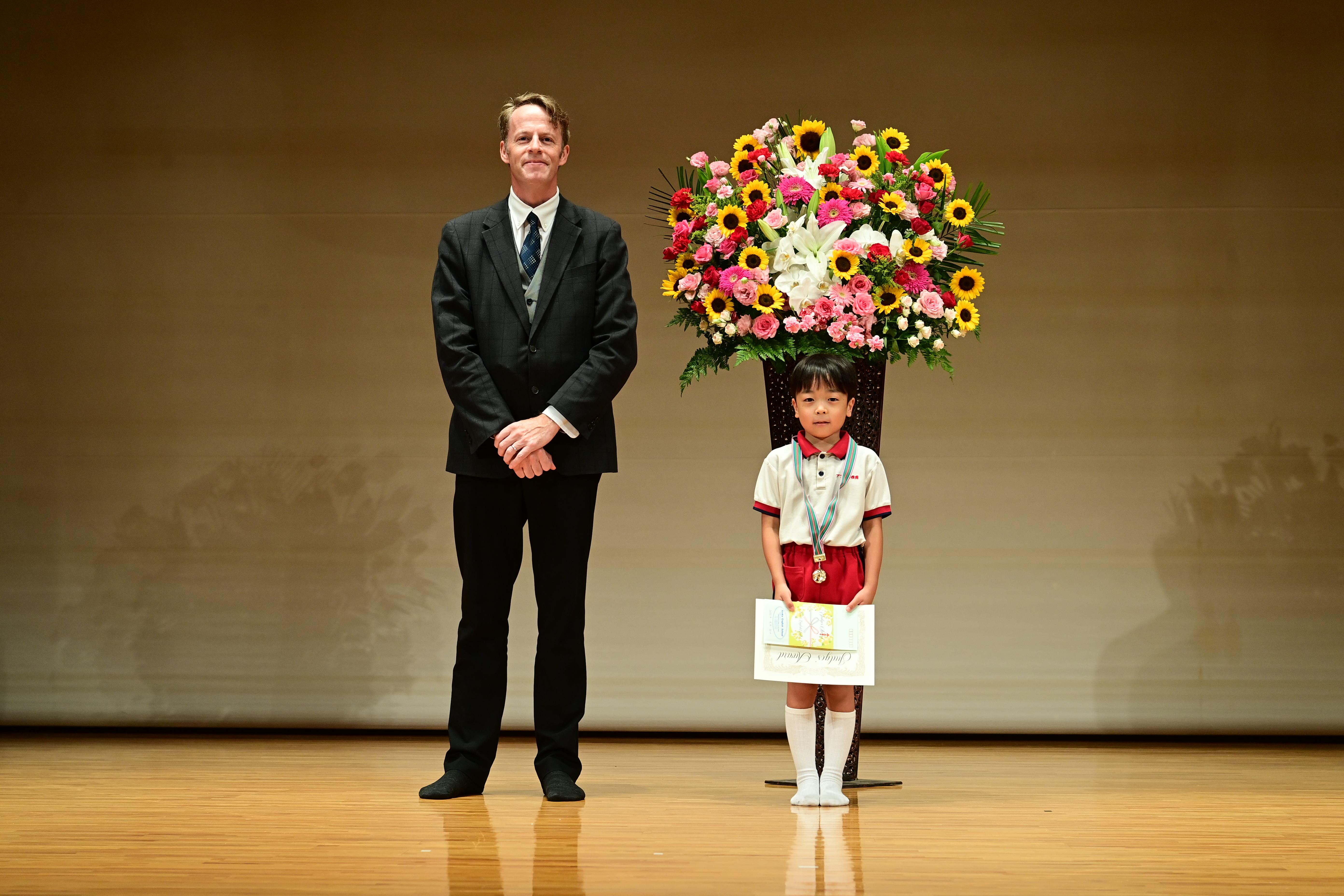 この度は、英語スピーチコンテストの最優秀賞を頂き、身に余る光栄です。年長時に初めて出場してから5年目を迎え、振り返ってみますと、様々な行事や発表会を迎える度に経験してきた「本番直前までの努力、本番当日の緊張感、本番終了後の達成感や悔しさ」が、本人だけでなく家族みんなに大きな影響を与えてくれたと感じております。この貴重な経験を将来に活かしていけるよう親として見守っていきたいと思います。